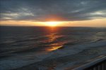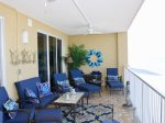 Sunsets from your large (10'X28') covered balcony are amazing. There is a dining table with lamp and a conversation grouping with cocktail table with solar lights, . Between two chaise lounges is a side table with a built-in ice bucket for chilling your favorite beverage.