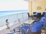 Oversized 280 sq.ft. covered beachfront balcony with cushioned furniture.