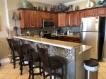 In the dining area is a large rectangular dining table with inlaid art glass. You can dine here in style, or snack at the granite bar on one of four comfortable barstools. The bar overlooks the gorgeous kitchen with custom finished granite countertops, upgraded stainless steel appliances and tile backsplash, highlighted by under-the-counter lighting. You are well-equipped to serve a gourmet meal here with all the extra countertop appliances, cookware and serving pieces.